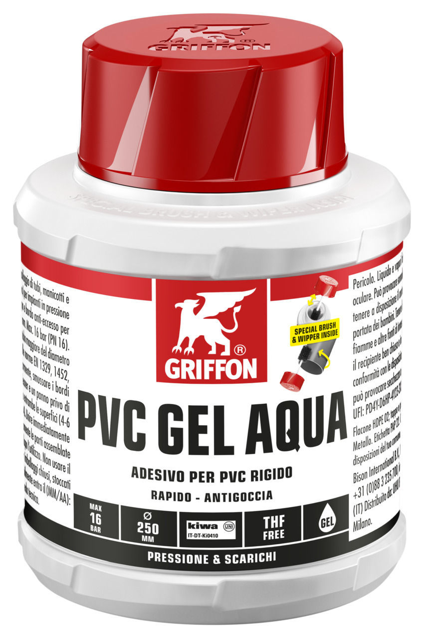 1. Tagliare i tubi perpendicolarmente, smussare i bordi e rimovere le sbavature. 2. Pulire le superfici da incollare con Griffon Cleaner e un panno privo di lanugine. 3. Applicare l’adesivo rapidamente e uniformemente su entrambe le superfici (4-6 volte) da incollare (strato spesso sul tubo, sottile sul manicotto). 4. Unire immediatamente le parti da incollare. Rimuovere l’eccesso di adesivo. Non caricare meccanicamente le parti assemblate per i primi 10 minuti. Chiudere immediatamente il contenitore dopo l’utilizzo.